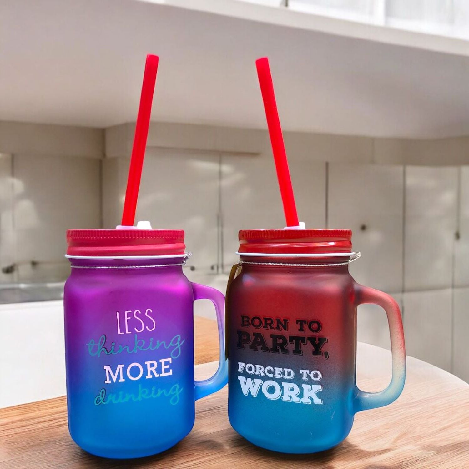 - Motivational & Fun Quotes ? One cup has "Less Thinking, More Drinking," while the other has "Born to Party, Forced to Work."